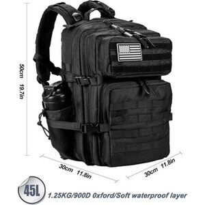 🧿1. Military Tactical backpack size approx: 12inch x 20inch x 12inch, Capacity: 45L; Military backpack is made of 900 oxford nylon fabric, durable and water-resistant. Suitable for fitness, travel, hiking, camping, and other outdoor activities.