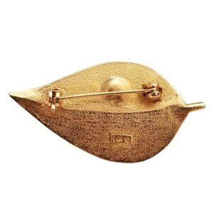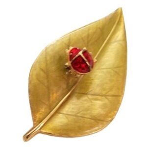 This LIA Green Enamel Leaf Ladybug Trembler Brooch Pin presents exceptional craftsmanship, making it a delightful part of any collection. It features a Leaf Brooch Pin crafted from a gold-tone base, with beautifully well-executed glazed green enamel on the leaf front surface accented with a red ladybug figural design on top attached through a movable part that jiggles or moves when worn. It measures approximately 1.8 inches in width and 1 inch in length. The reverse is marked "LIA©" on an embossed rectangular cartouche. The back of this Trembler Brooch has a secure clasp closure ensuring it stays securely attached to your clothing or accessory throughout the day.