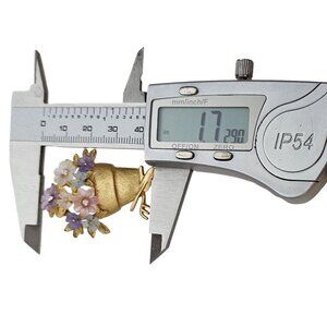Lianna LIA's vintage costume jewelry is known for its high-quality and hand-crafted brooches. This LIA Flower Pot Brooch Pin will make a lovely adornment, and a stylish choice for most occasions. It features a radiant gold-tone flower vase pot figure with gardening tools in a polished finish. The beautiful flower blooms are crafted from pink, blue, and purple Lucite materials. It measures approximately 1.5 inches in width and 1.7 inches in length. Hallmarked © LIA on the reverse, finished with a rollover clasp pin that functions properly and is in good vintage condition.