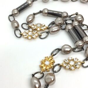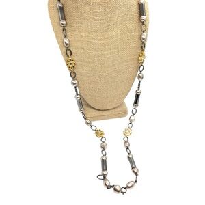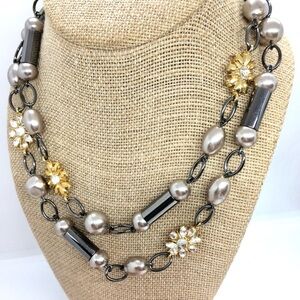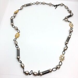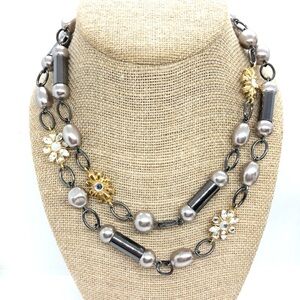 Stunning 36” Lia Sophia necklace featuring a unique blend of gold-toned floral accents, pearl-like beads, and hematite-colored links. This versatile piece includes a 1.5” extender for adjustable length, allowing you to style it in various ways. Perfect for layering or wearing solo, adding a touch of elegance to any outfit. In great condition with a Lia Sophia tag attached.