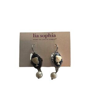 LIA SOPHIA-WOMENS NAVY STONE WITH FACE DETAIL ANND DANGLING PEARL EARRINGS