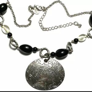 This vintage necklace by Lia Sophia showcases a timeless and elegant design, featuring a silver-tone chain with intricate accents. It is adorned with large, carved beads that add a touch of sophistication and detail to its appearance. The centerpiece of the necklace is a beautifully engraved silver-tone pendant, showcasing floral-inspired patterns that evoke a vintage charm. Adjustable in length from 15 to 18 inches, this piece is perfect for complementing a variety of outfits, from casual to formal. Signed by Lia Sophia, it carries a touch of authenticity and uniqueness that collectors and jewelry enthusiasts will appreciate.