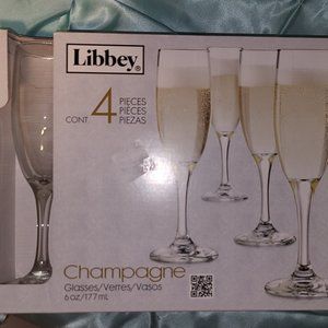Very nice set of four (4) champagne flutes/glasses from LIBBY. NEW IN BOX and in new/excellent condition. These glasses are made of thick glass...not flimsy...very solid feet. DIMENSIONS: 8.5" tall. 6 oz. Perfect for any celebration!