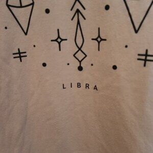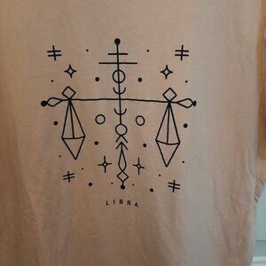 This t-shirt is made by Bella + Canvas, in a soft blush color. There are no flaws or rips. It features the glyph for Libra.