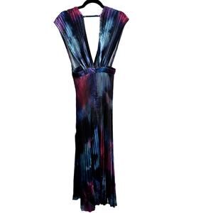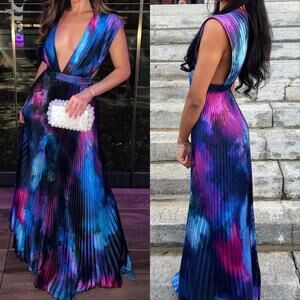 Tags: formal, wedding guest, gala, event im, special occasion, evening, tiedye, plunge neck, accordian, night, fancy, multicolored, mulitcolor, multi