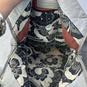 Snap closure with side zippers to widen entry. Front zip pocket. Inside zip pocket and 3 slip pockets. Floral canvas liner. Feet on base of bag. This bag has a distressed look. Excellent Used Condition. 100% Goat Leather, Imported. Pockets: 3 interior slip, 1 interior zip, 1 exterior. An easy shoulder bag by liebeskind berlin, the kumba is ideal for everyday carrying. Her unique shape is complimented by her spacious main compartment and trendy detailing. Soft, distressed leather is the cherry on top that makes kumba an absolute stand-out.