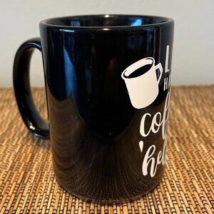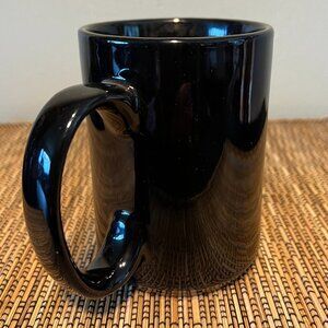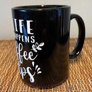 Onyx black ceramic mug with an engraved image of a white coffee mug and sprig of leaves with fancy, incised white lettering that reads: LIFE HAPPENS COFFEE HELPS. Large comfortable handle. Measures 4.75” tall with a 3.25” diameter; 5” across including handle. Holds 16 fluid oz.