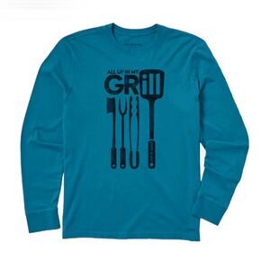 Perfect for any casual occasion or a laid-back day at the grill, this Men's Long-Sleeve T-Shirt from Life Is Good offers a comfortable fit and versatile style. The blue cotton fabric features a fun grilling-themed graphic print, adding a touch of personality to your ensemble. With its crew neck design and machine washable care, this shirt is as practical as it is stylish. Enjoy the ease and simplicity of this regular fit, graphic design tee.