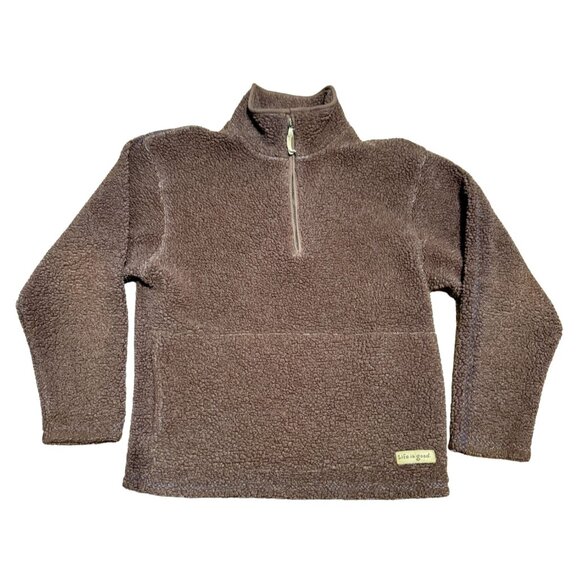 Soft, brown, Sherpa pullover jacket from Life is Good. Size S, featuring a 1/4 zip and a mock neck. Made from 85% polyester and 15% rayon, it ensures both comfort and style for women.