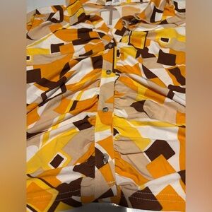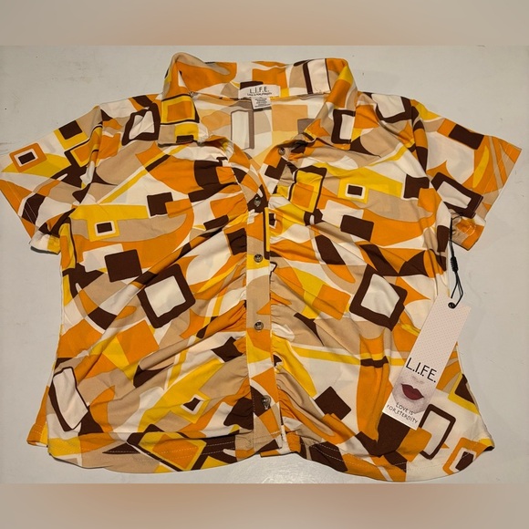 Vibrant geometric button-up shirt by LIFE. Features a mix of orange, brown, and cream colors. Perfect for a bold look.