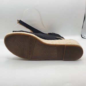 Pre-loved but in awesome condition, black sling back, wedge heel sandals with side buckle. Super comfy. 2" heels. Size 9.5.