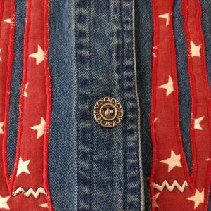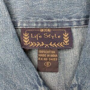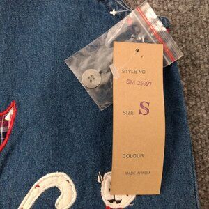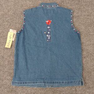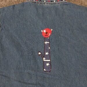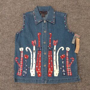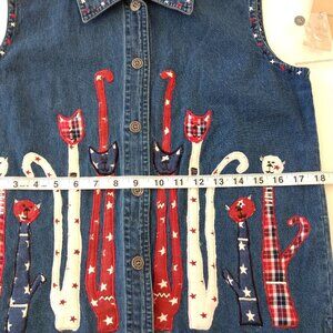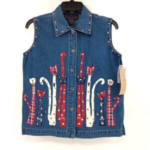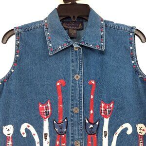 LIFE STYLE Vest Women's S Blue Denim Embroidered Cats Applique Button