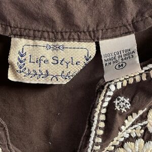 LIFE STYLE Vintage Boho Embroidered Floral Peasant Style Brown Cotton Top Medium