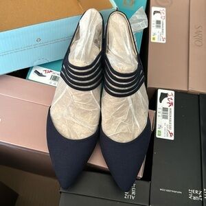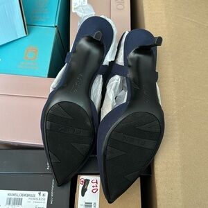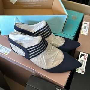 Modern and minimal, this standout pump adds a contemporary feel to any look. Microsuede upper with a pointed toe, heel sling strap, and striped stretch gore strap.