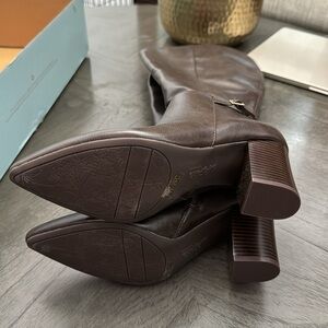 All eyes on these. Amp up your wardrobe in this sharp, knee-high dress boot. Croco faux leather or faux leather upper with a pointed toe, side zip, strap and buckle detail, and covered block heel. Soft System® comfort package provides all-day support, flex, and cushioning. Traction sole provides you with extra stability. Just Right Height 2.75-inch block heel.
