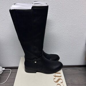 Classic and comfortable, this womens wide calf riding boot will keep you looking and feeling great all season. Faux leather upper with a round toe, crisscrossing strap detail, metallic stud, and stretch back panel.