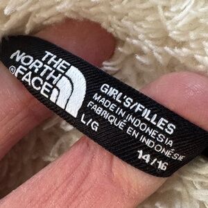 Hooded down puffer jacket In Good Used condition. Fleece lined hood; body 75% down; Elastic at wrists; hem falls below natural waist; small spots near north face insignia on back shoulder and along left front placket. - see photos for zoomed in detail. No tears/rips;