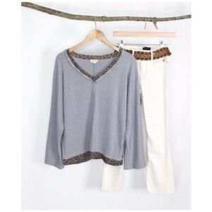 Light Gray V- Neck Ribbed Top w/Leopard Print Trim