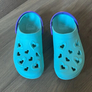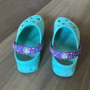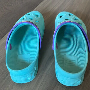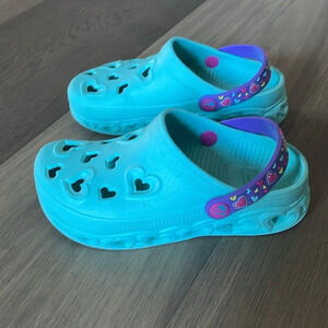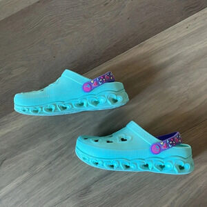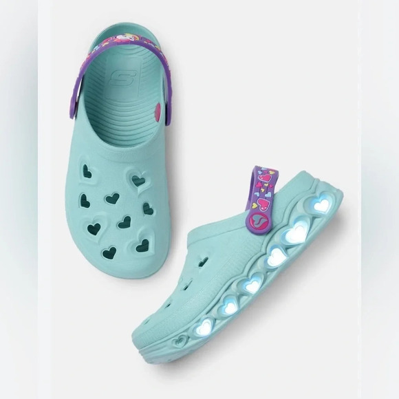 Step into magical heart-filled style with Skechers Foamies®: Light Hearted - Unicorns & Sunshine. This light-up sculpted comfort slip-on clog features a flexible perforated EVA upper with a light-up midsole and convertible heel strap.