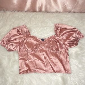 A light mauve woven top featuring a satin fabric, sweetheart neckline, short puff sleeves, ruffled trim, padded bust, and a cropped-length.