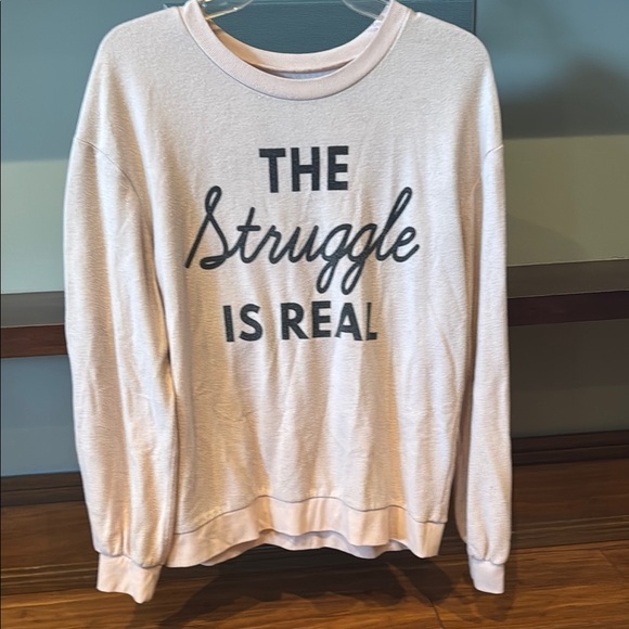 Cozy sweatshirt featuring bold black text 'The Struggle Is Real'. Perfect for casual wear. Fits more like a M.