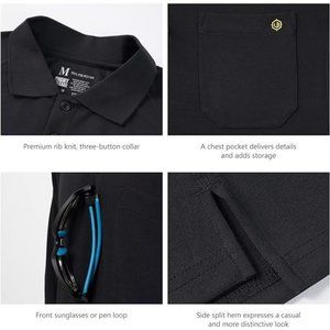 Relaxed fit, side mesh panels, rib-knit button collar, front sunglasses or pen loop, and a chest pocket.