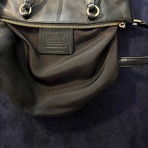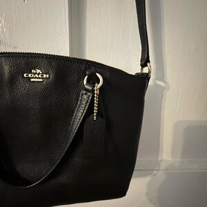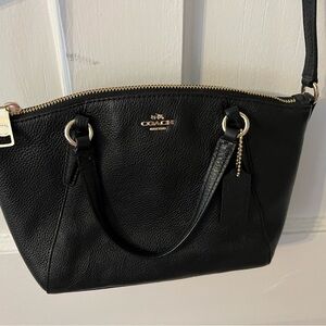 Like new, black pebble leather Coach Kelsey bag. No scuffs or scratches. Used on two different occasions. Has an adjustable crossbody strap and drop handles for carrying. Has gold hardware and hang tag. Measures approximately 10” x 7” x 2”. #D1780-F57563