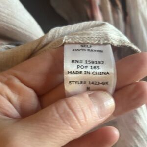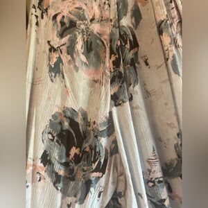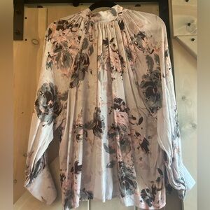 Iron ball buttons from the neck to the hem- can be buttoned all the way up or lay slightly open. 3 ball buttons on each cuff. Billowy sleeves and long cuffs- like a modern Victorian blouse. Lilac with beautiful blues and pinks. Worn once excellent condition. Purchased from VICI. (S2)