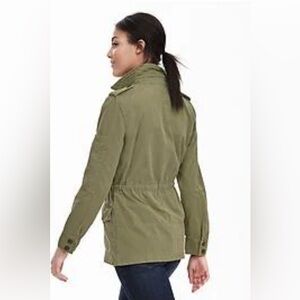 Worn only twice- perfect condition. Longline army green military jacket. Fully lined and 100% cotton. Interior cinch waist adjusters. Button front, pockets and cuffs. (S1)