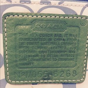 Coach mini Hampton weekend tote handbag 6268 - reversible and water resistant! Excellent condition, LIKE NEW! Measures 6 x 12 x 3 inches. On one side is light blue coach pattern with brown handles and tan trim. When turned inside out, the bag is a solid blue with blue handles (as seen in cover photo). Like two bags in one ;)