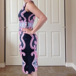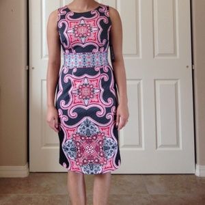 Black with pink, white, and red designs. Super comfy and extremely figure flattering!