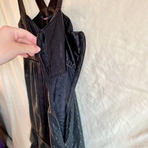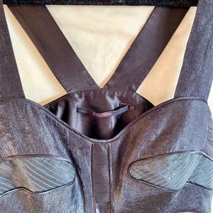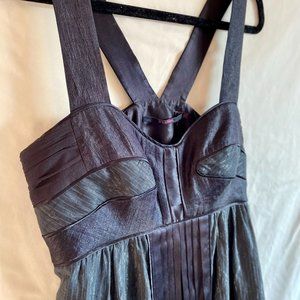 This cute dress is from Erica Davies and it is in an excellent condition. It's an all-black dress, but the dress is made from different types of fabric and details of metallic thread stripes. The bodice is made from a taffeta-type material with accents of satin, chiffon-like fabric, and the cotton blend fabric with shiny threaded stripes. There is a detail down the center of satin vertical pleats that accentuate the bust line and the top of the dropped hem. There are seam details along the bust cups and the along the empire waist. The straps are a wide satin-blend and go diagonal over the shoulders to the back. The skirt of the dress is similar to that of a shift dress, because it doesn't flare out--it's not meant to be tight fitting to the body, but it is cut more straight from the waist. The dropped hem is layered with all of the fabrics in the dress. There is a side zippered closure, and the straps are not adjustable but could easily be altered. There is an attached full length lining underneath. This dress is short and hits a bit above the knee on a person standing 5'4--Depending on height the length will vary. The dress is non-stretch.