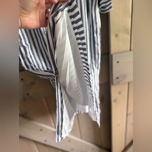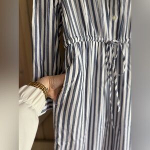 Striped shirt dress with self tie waist for cinching. Long sleeves, 2 button cuffs. Lined bottom with side slits. Looks cute dressed down with sneakers. I wore it dressed up with red suede pumps for work. A classic that belongs in everyone’s closet!