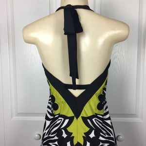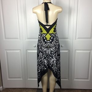 Gorgeous dress with scarf cut. Black, white and fluorescent green colors. High in the front and back and low on the sides. Bust is lined .