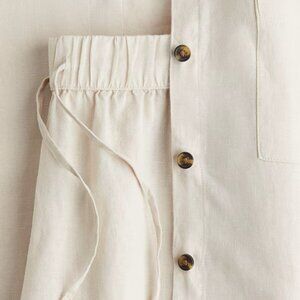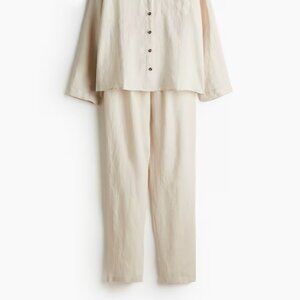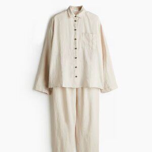 Pajama shirt and pants in washed linen. Shirt with turn-down collar, buttons at front, and open chest pocket. Wide-cut pants with covered, elasticized waistband with drawstring.