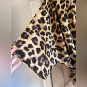 Worn only once. Leopard dolman sleeve kimono wrap blouse. Inside and outside tie closure. Side slits on hem. 100% polyester. Generous sizing. (BIN8)