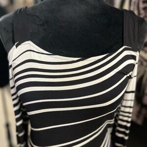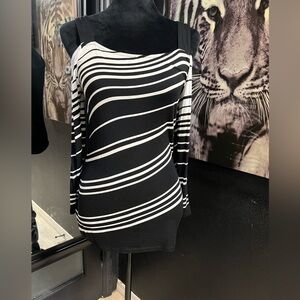 🖤🤍LIKE NEW I.N.C. INTERNATIONAL CONCEPTS BLACK AND WHITE STRIPED OFF THE SHOULD BLOUSE SZ M🤍🖤