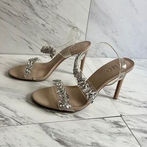 - Cascading shimmering strappy rhinestone embellishments atop the foot