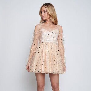 A romantic sweetheart neckline with belle sleeves adorns our Cierra Tulle Mini Dress. Dress features embroidered dot detailing throughout with frill at the neckline and back. Thin straps and sheer long sleeves with ruffled cuffs accentuate the carefree flow of this dress.