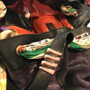 LIKE NEW La Gioe di Toscana by Sharon Gioe fur bag. Limited edition as you can see plate on back. Been sitting in my closet and I never use it. Beautiful bag made of genuine leather and dyed dark purple calf hair. Copper interior leather is stunning and soft. I've used the bag only a couple of days total. Scarf ties to close bag. You switch the scarf with any of your own to change the look of the bag. FAST SHIPPING AND GREAT RATINGS.