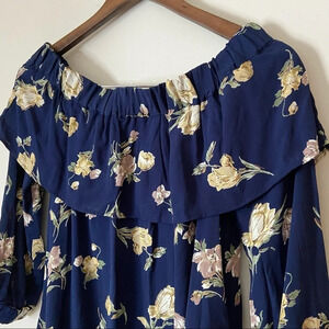 • mini dress, off the shoulder wear. can be worn as longer tunic. navy floral flowy fabric 100% rayon in color “deep blue blooms” with vintage style floral pattern, ruffle portion along neckline. Versatile piece! Has pockets. Elastic scrunch band at neck and end of sleeves. Pit to pit: approx 16in, Collar to Bottom Length: approx 26in