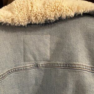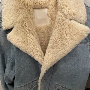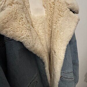 Impeccable condition - appears brand new/never worn. Size Large - oversized/roomy fit. Rinse/colorway is a true-blue faded denim called Bless You. Snap placket closure, moto-style collar, front welt pockets, adjustable cuff and bottom-hem snap details. Lined in incredibly luxe and plush sherpa.