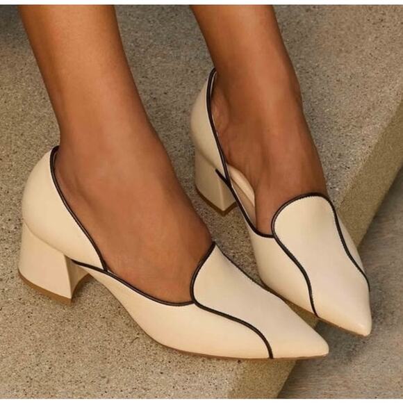 mavette, pointed toe pumps, block heel, contrast trim, cap toe look, parisian, work shoes, office, wedding guest, neutral heels