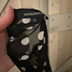 Sheer polka dot overlay; solid black slip beneath. Cinched waist with ruching that stretches and is forgiving. Elastic cuffs. Button keyhole close at back neck.