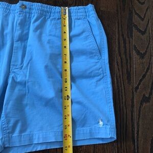 Details: Polo Ralph Lauren Men’s XXL Light Blue Khaki Stretch Classic Fit chino shorts. Adjustable hidden waist with inside drawstring. Deep front side pockets. Buttoned back functional pockets. Zip and button front closure. Embroidered logo on bottom left leg hem.