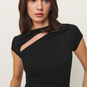 Stylish black crop top with an asymmetric cut-out. Perfect for a modern look. Pair with jeans for effortless style.