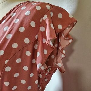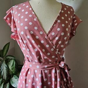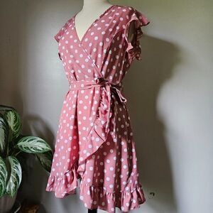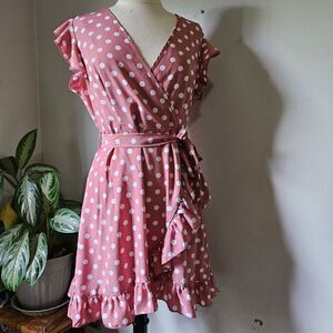 LIKE NEW SHEIN PINK WHITE POLKA DOT WRAP DRESS BELTED SIZE L