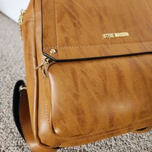 LIKE NEW Steve Madden Backpack Purse Bag. Like new, used once, no noted flaws. Similar to a Faux Leather texture but a little more smooth. Gold zippers and decals. Multiple inside and outside pockets to keep you organized. Adjustable backpack straps. Approximately 10.5" wide, 12" tall, 5-7" deep (measured with and without front pocket). Coming from a pet and smoke free home