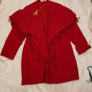 LIKE NEW Vintage Red Wool Fringe Embroidered Pea Coat Western Bohemian Winter
