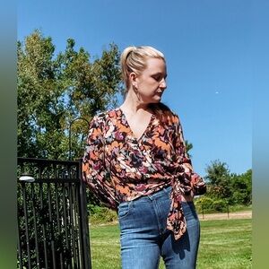 Boutique find- beautiful floral on navy background. Cross over, button inside and self tie waist. 100% rayon. Worn once. Excellent condition. (BIN9)